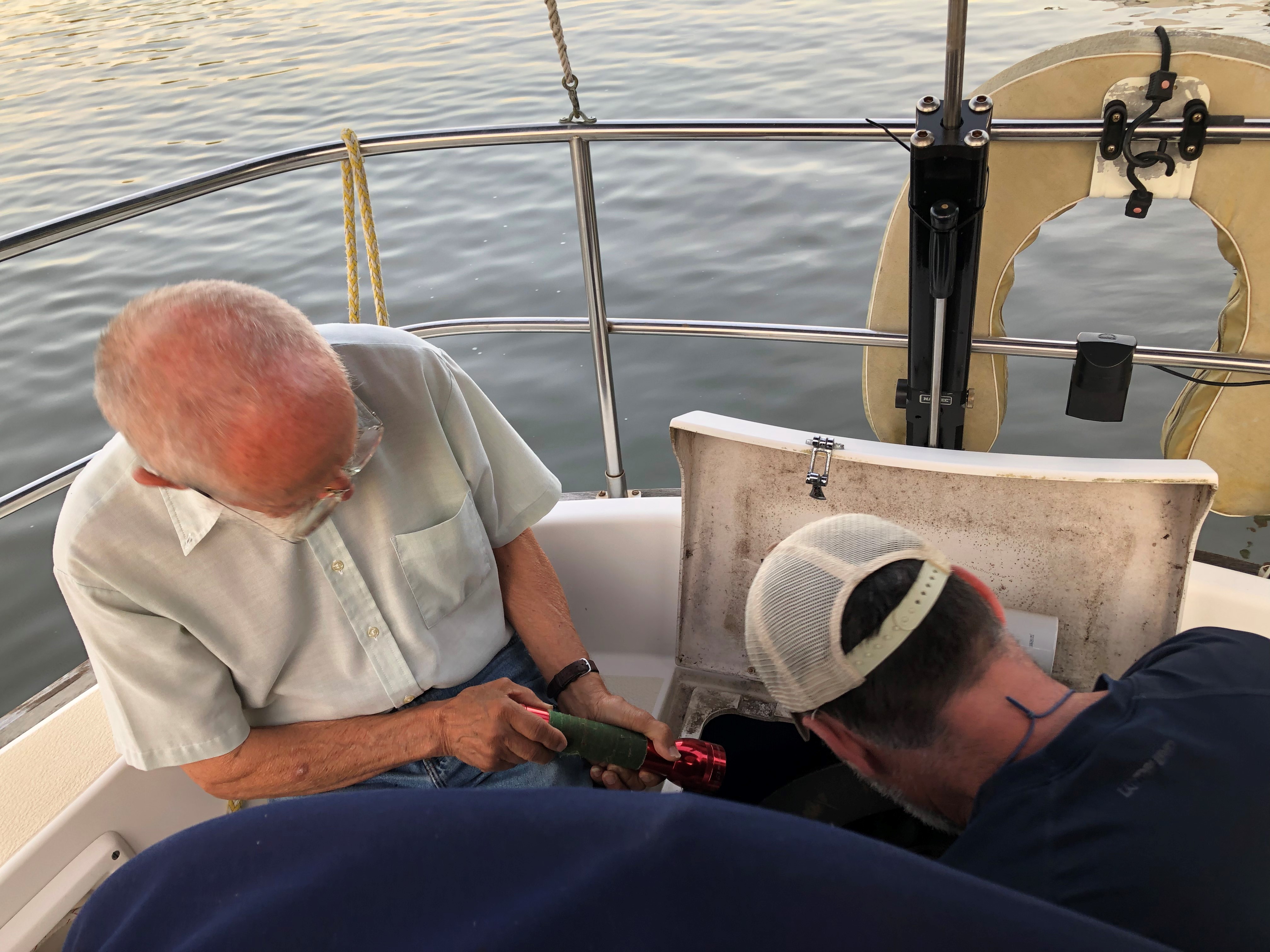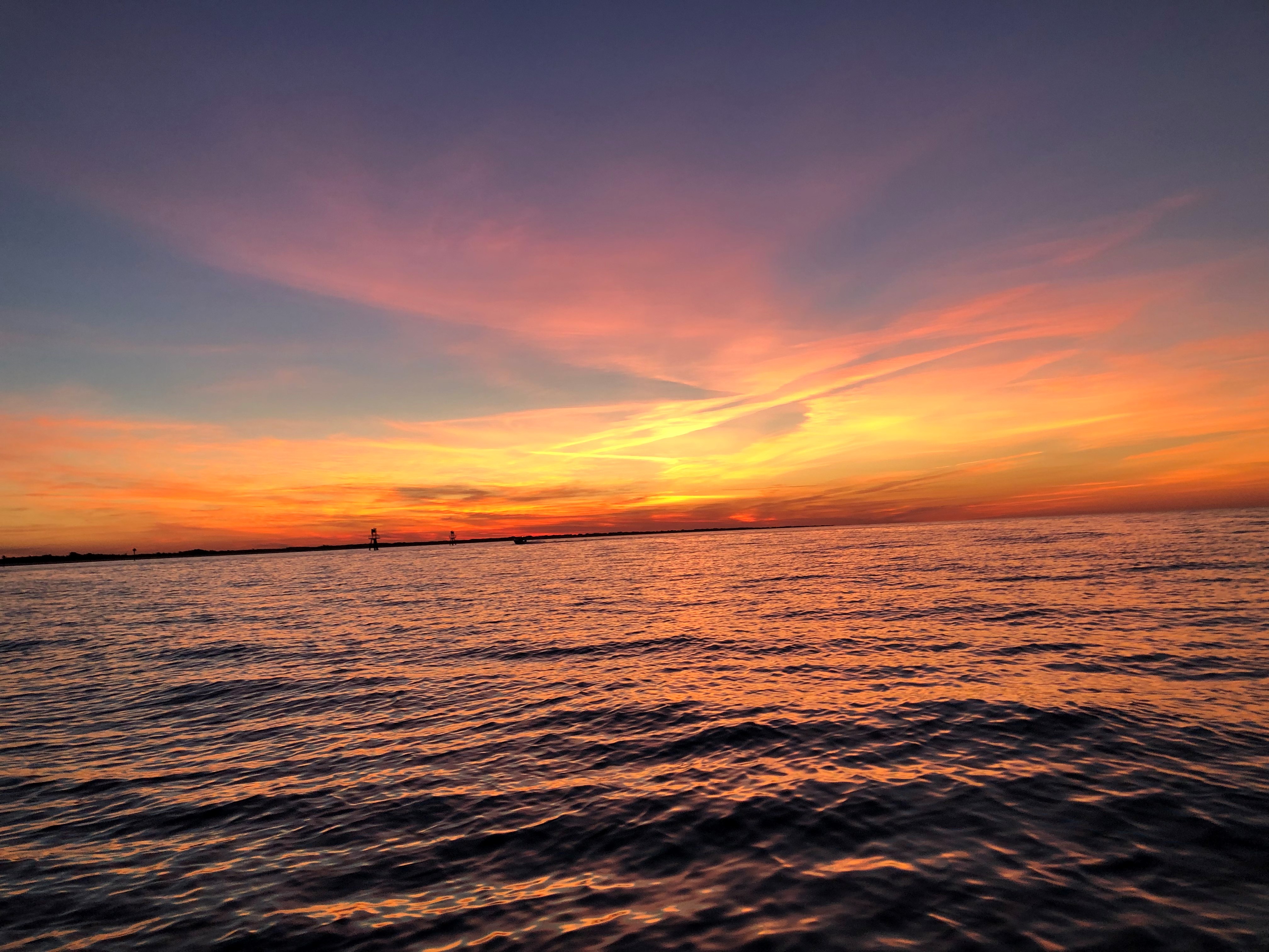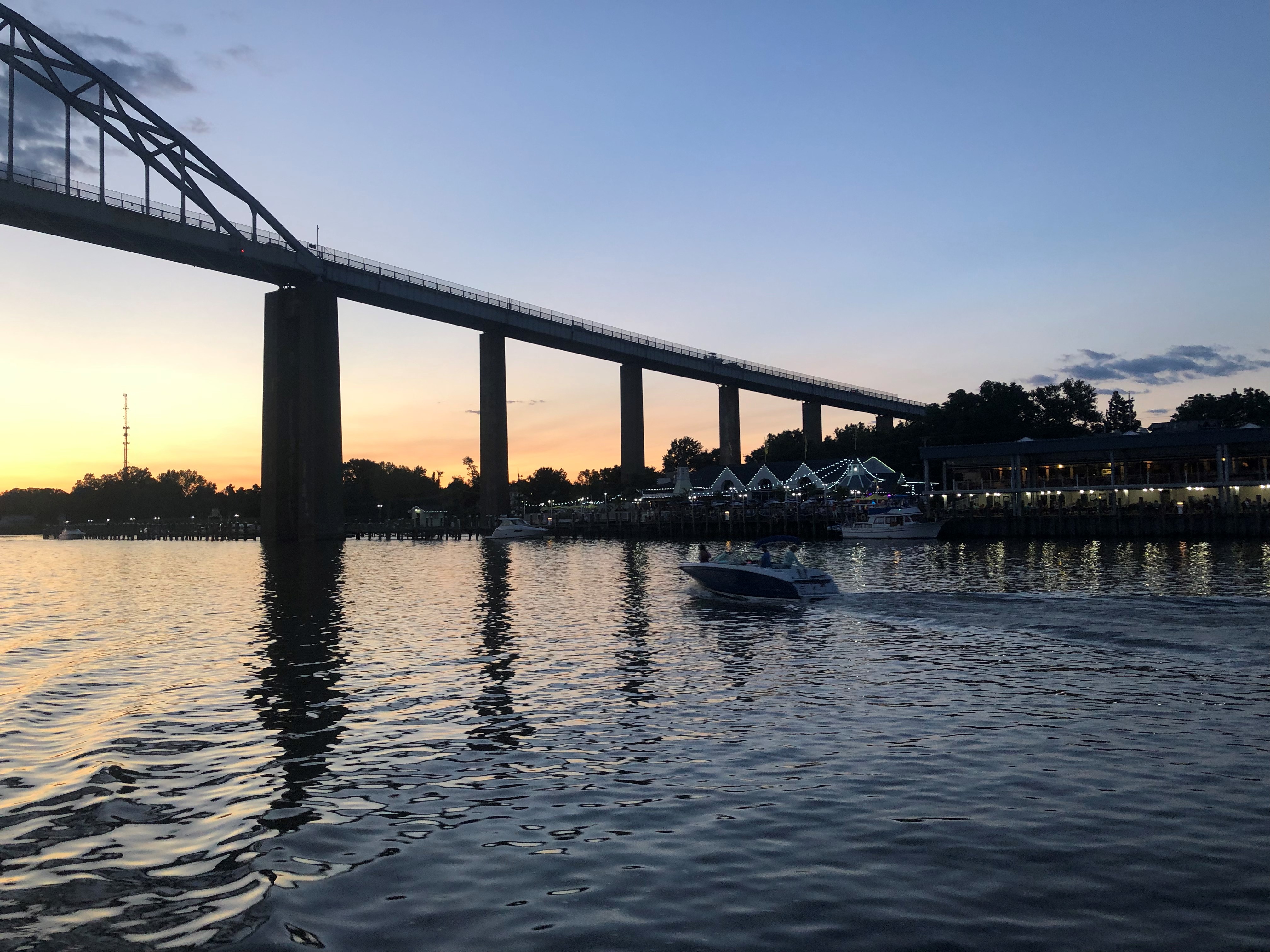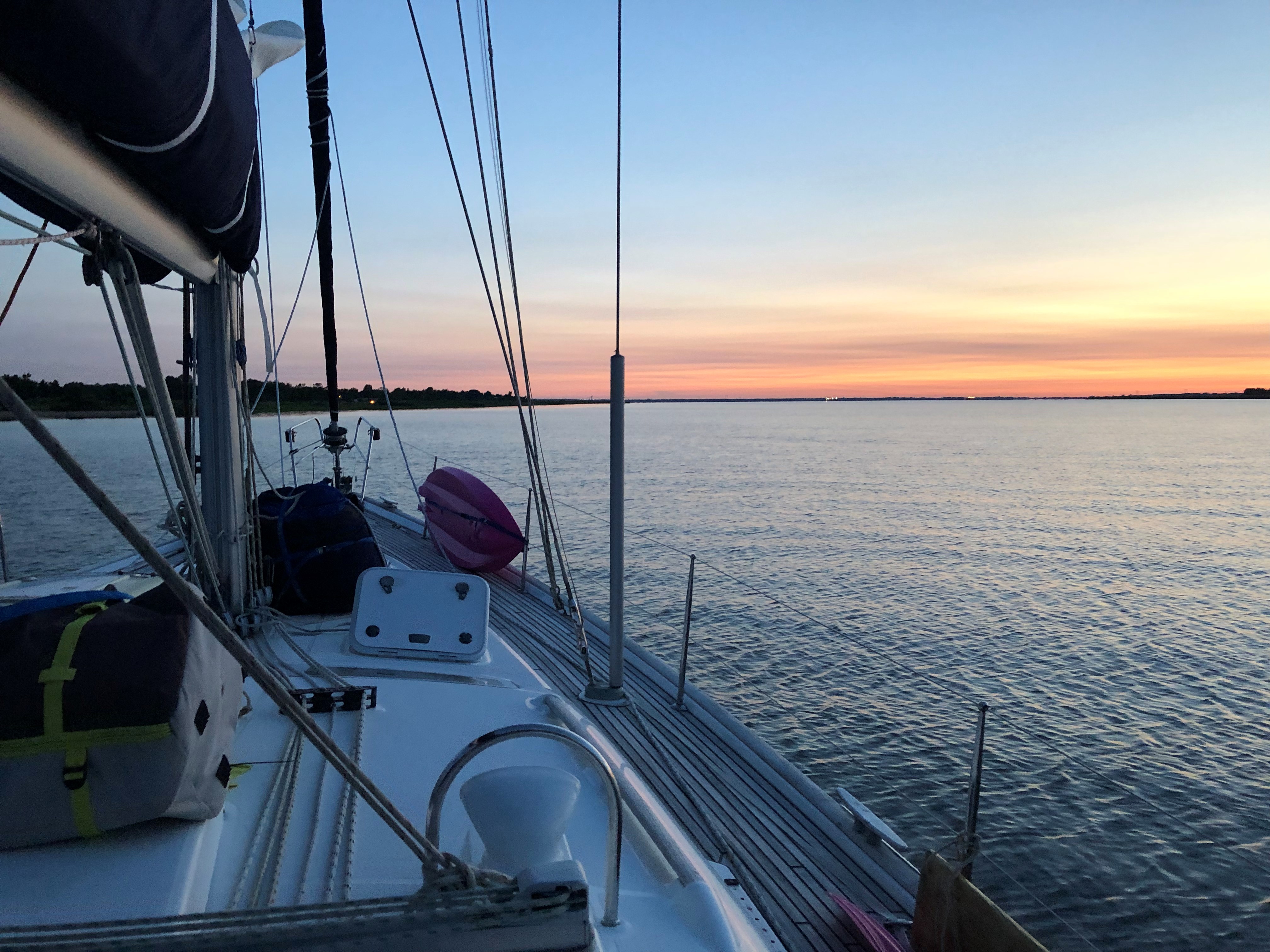 The next morning, we were off again. What a contrast the mouth of the Severn was. The day before, we were the only boat out there. The day we left, boats of all kinds were on the water like fire flies on a summer night – power boats zipping around and sailboats racing around markers. Usually, I would love seeing the activity, but that day I was happy to sail under the Chesapeake Bay Bridge into a bit more solitude. We got to the C&D canal at dusk to hit the current just right to make over 9 kts. The lights and music from the riverfront restaurants were picturesque being back lite by the full sky sunset and framed by high train trestles. All was quiet in the canal; we saw only 3 barges and they seemed happy to chat on the radio as we passed.