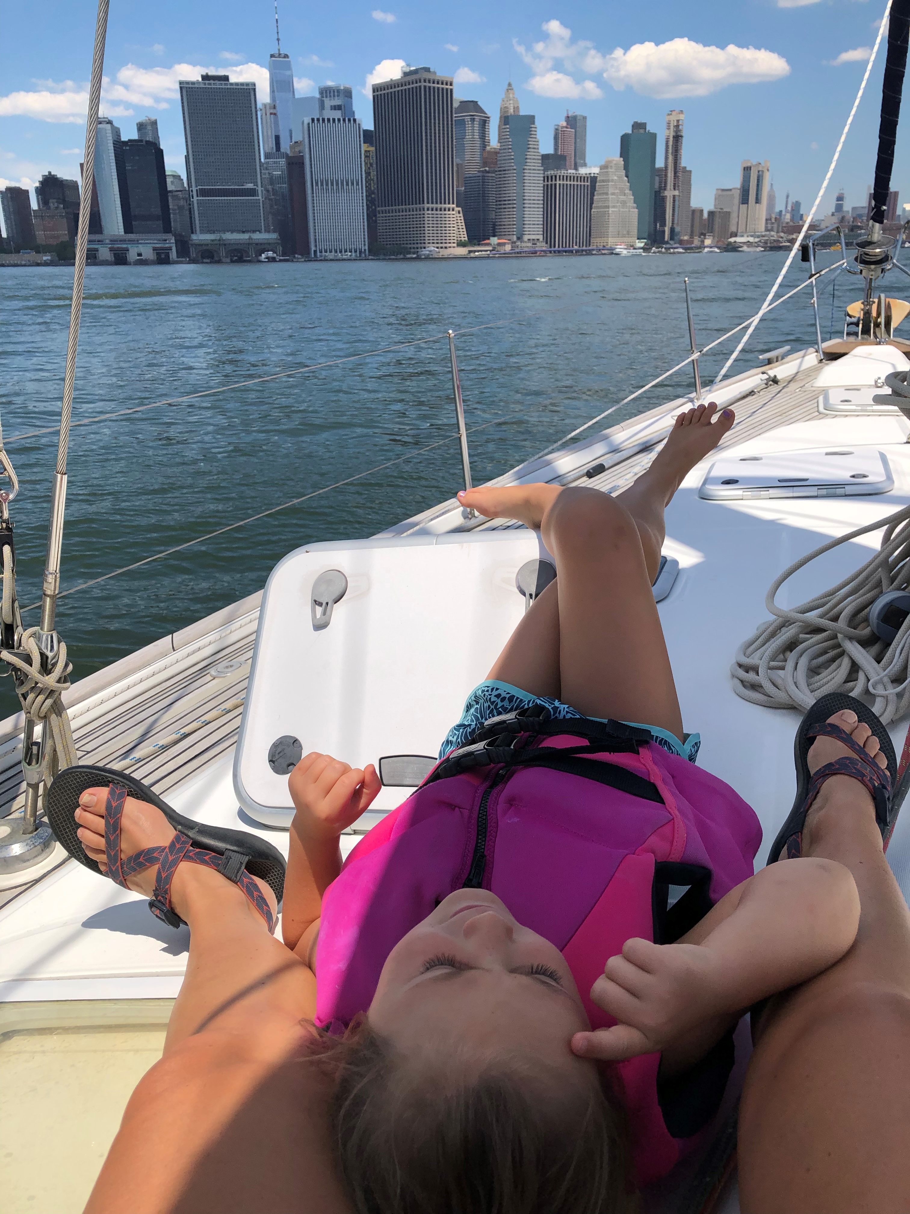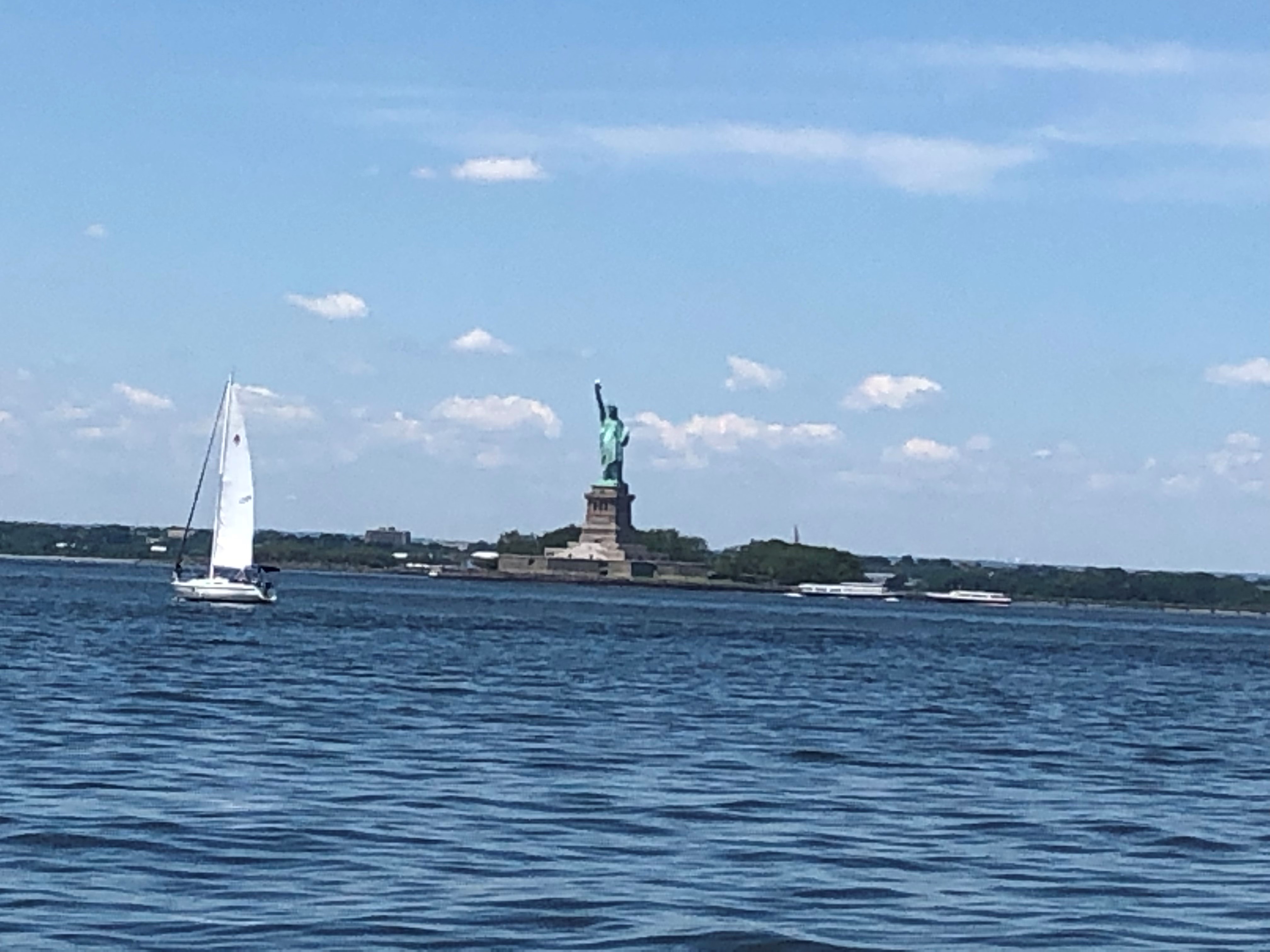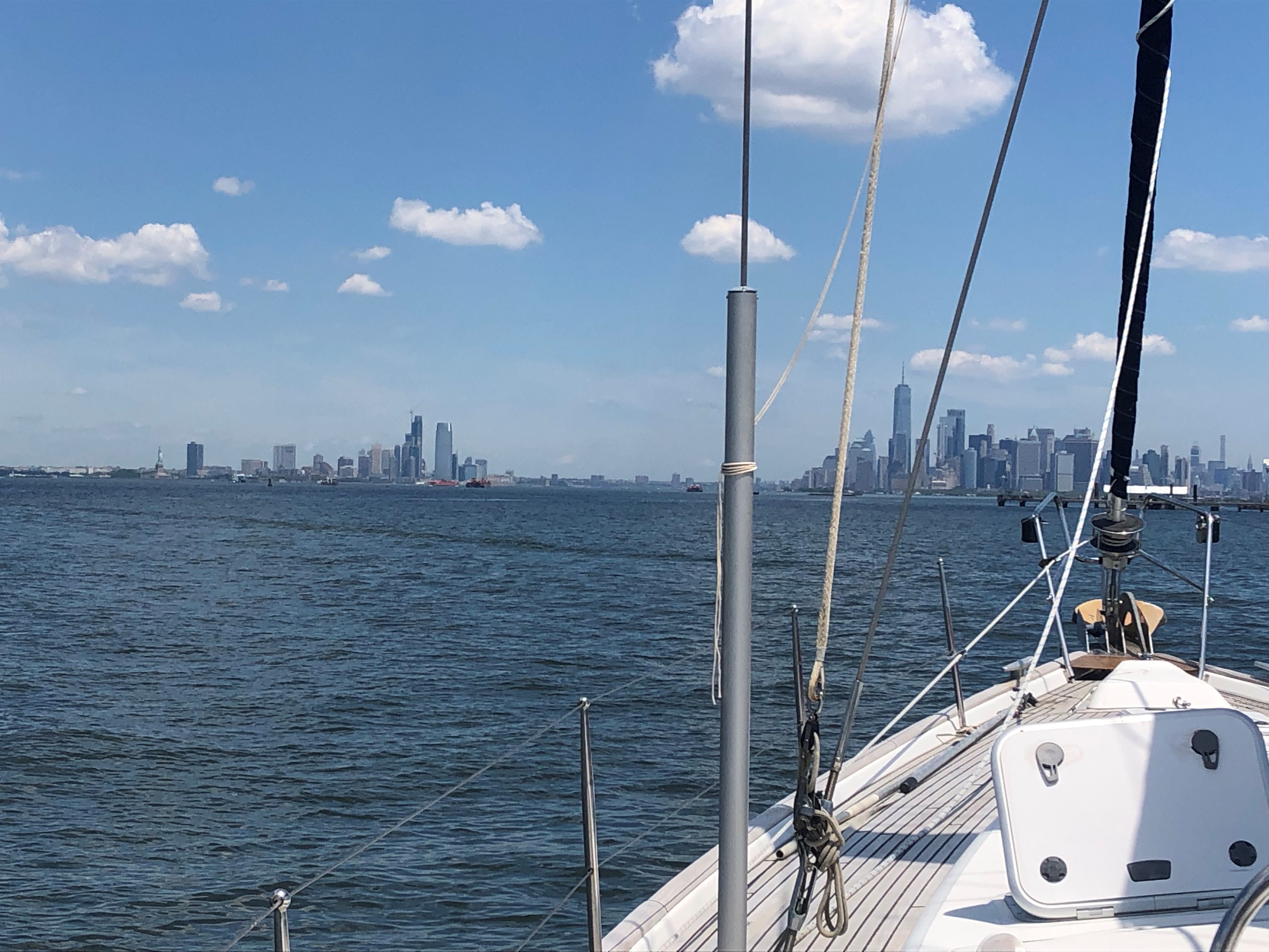 After a couple days off the boat and with easy access to laundry, a car, and groceries, we loaded up provisions and headed back to Beyzano. While sad to leave our friends, we had an exciting day in store as we were heading up the East River, passing through NYC. The day was beautiful with clear blue skies and a comfortable temperature – we couldn’t ask for a better day for the adventure. After a couple hours fighting the current crossing the Lower New York Bay, we were under the Verrazano-Narrows Bridge and into the Upper Bay. While still fighting some current, we were able to take some detours that allowed us to come around the south side of Governor’s Island such that we were entering the East River right as the currents were changing in our favor. The Statue of Liberty was off our port side and Abby was excited to see her after having learned about her in school (she immediately requested a picture be sent to her teacher!).