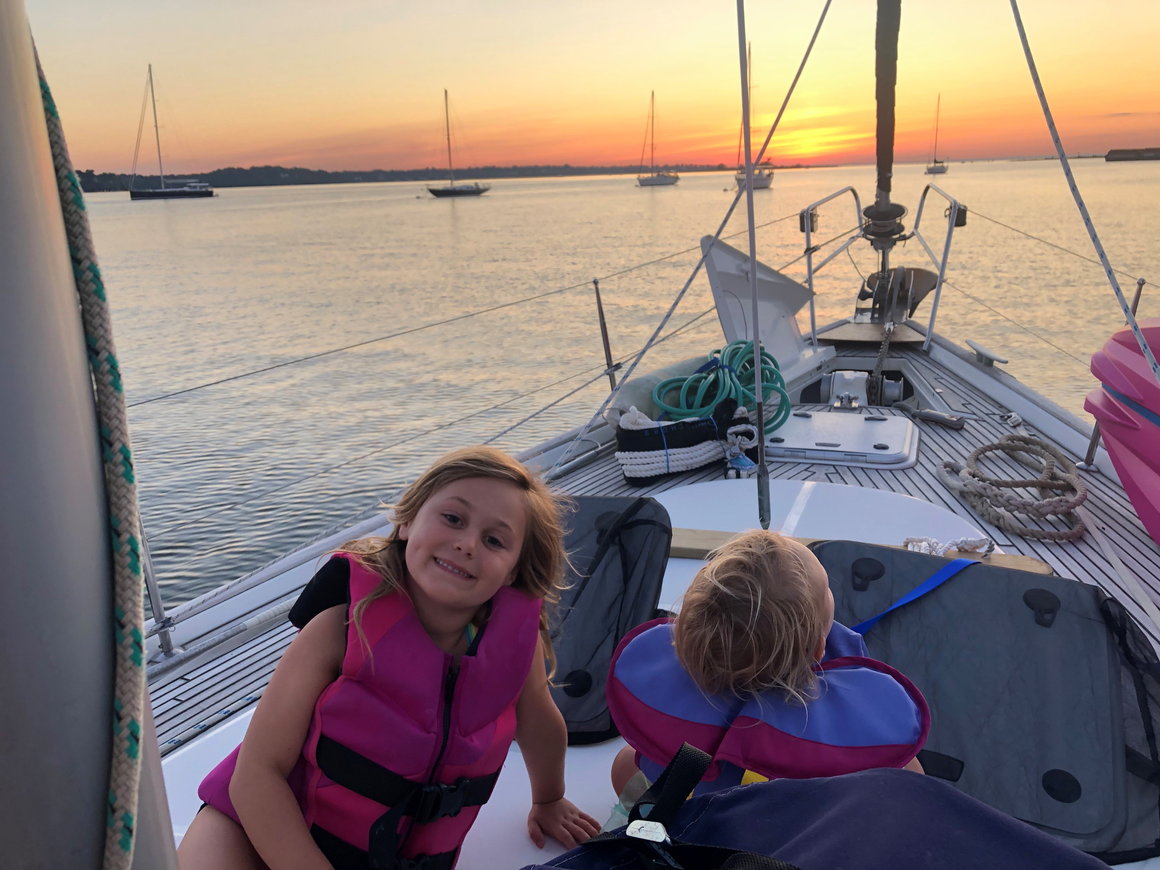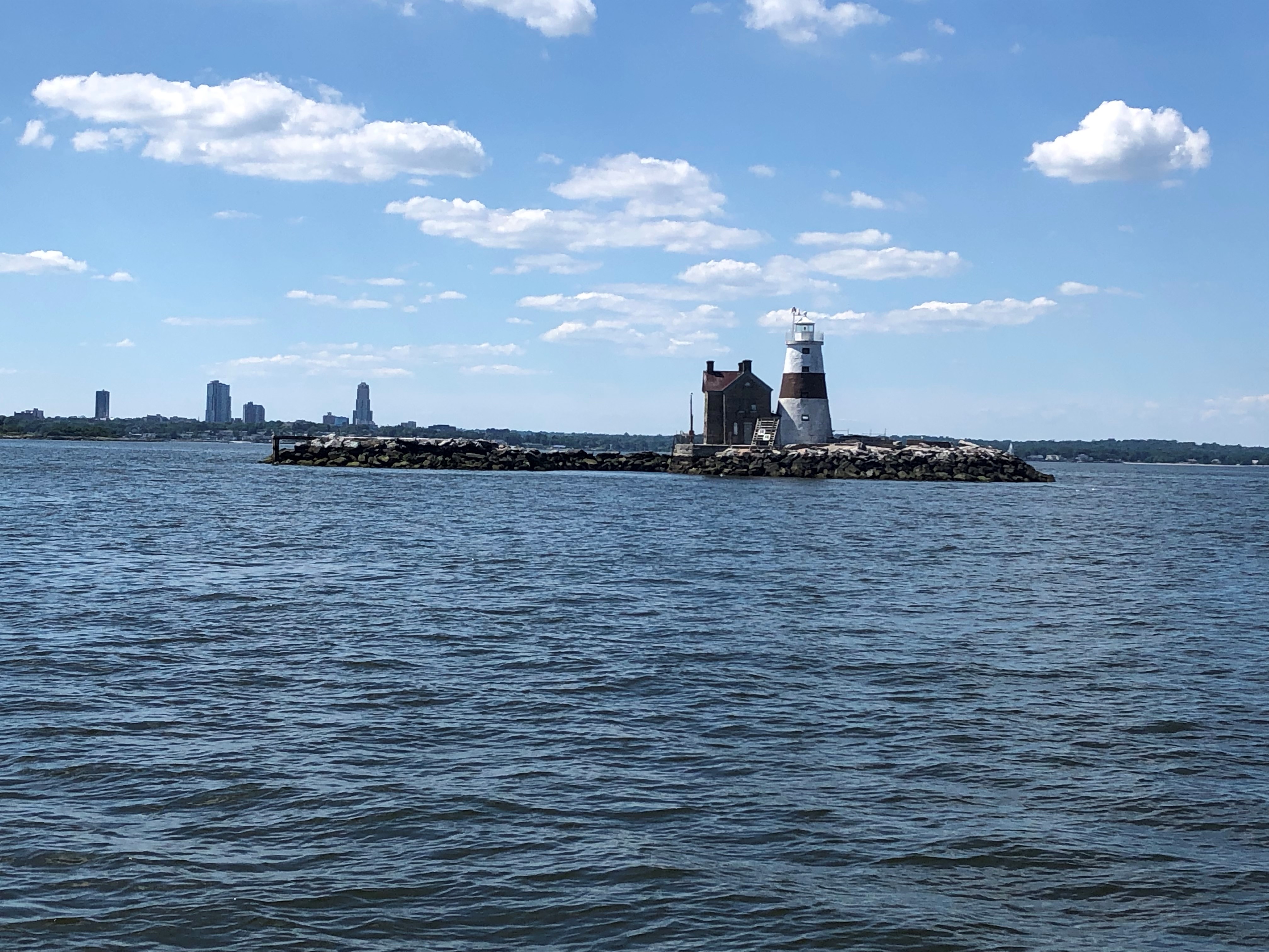The real current push on the East River is coming through Hell’s Gate and we sure got a boost, hitting 10 knots while motoring. We were able to ride the current under Throgs Neck Bridge, the last official bridge of the river, and then we were officially in the Long Island Sound. Once in the sound, we still had a little current with us and decided we would push as long as possible with the hope to make it to Port Jefferson, NY. Wind was lacking so it was an afternoon of motoring with dinner underway. We pulled in to Port Jefferson around 8 PM and used the last bit of light to scout out a place to anchor. For the first time, Abby and Mollie joined me up front as we set the anchor, adding a little extra excitement to an already exciting cruising task. Once anchored, we pulled out our string Luci lights for the first time and enjoyed their awesome glow as twilight faded.