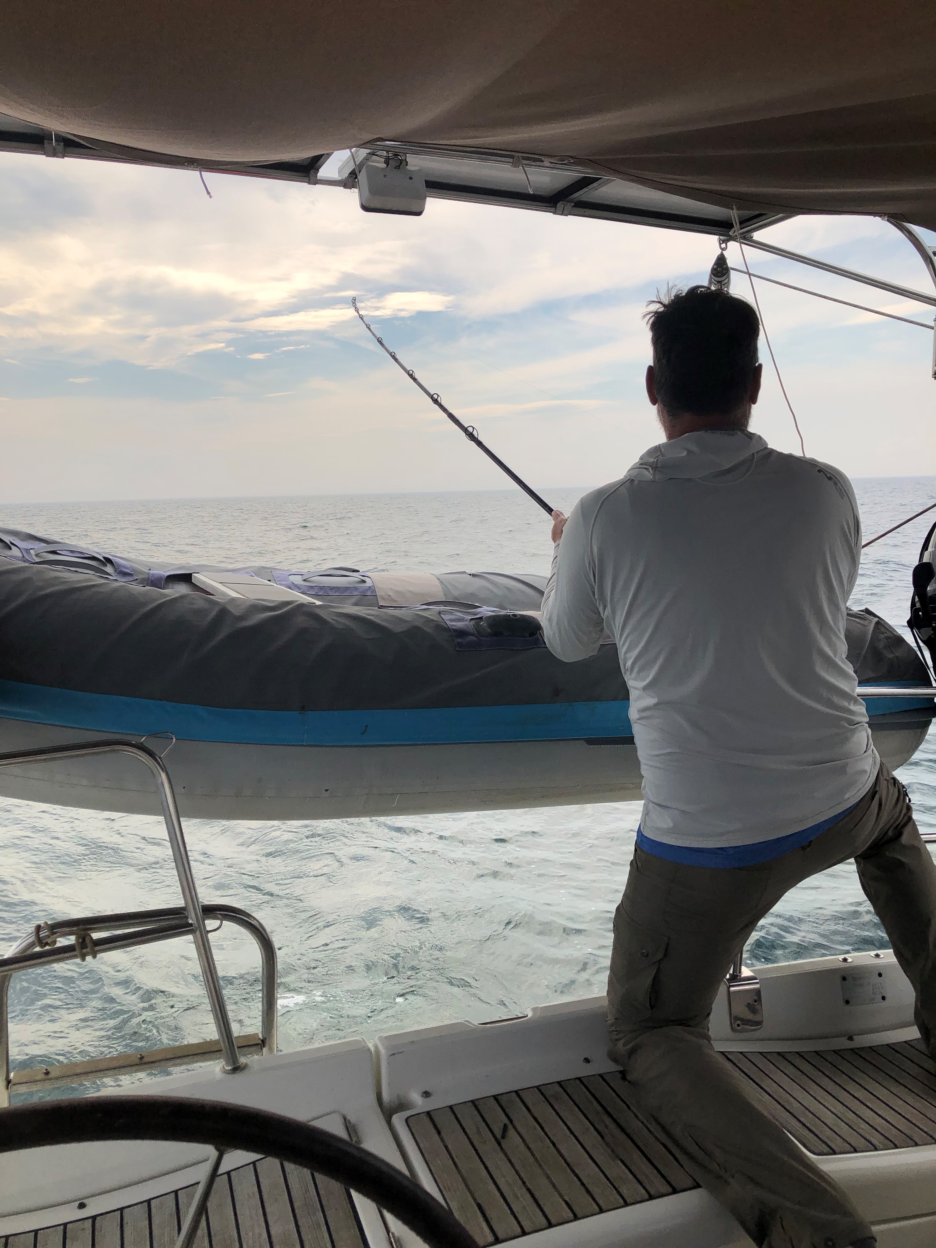 Living on a boat, you are completely reliant on the engine and count on it to crank each time you turn the engine key. When we turned the key at 6 AM on June 29th, there was no crank! Mark was quick to rig up jumper cables so we could use the house batteries to start the engine, and with only a minor delay, we had the anchor up and were underway. Looks like we are going to need to look at replacing the starter battery in the not too distant future! While once again there was no wind, we did plan our departure to have the current of the Long Island Sound in our favor, allowing us to enter the Block Island Sound shortly after noon. We knew we were getting more to the north as this was our first encounter with fog, though luckily it was light and cleared as the afternoon progressed. Mark has been so excited to fish on this adventure and we had lines out. As we were getting close to Block Island, we had a fish on and had to pause while Mark reeled in a massive blue fish (thanks to Janet K for the fish id!). The girls were both napping, which was probably good since this was our first time hauling in and filleting a large fish on Beyzano. Mark did a great job and kept the mess minimal, while I got the fish marinating so we could grill it up for dinner that night.